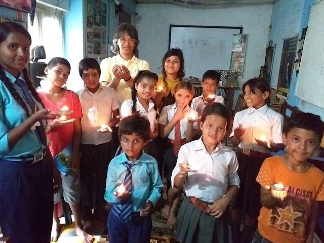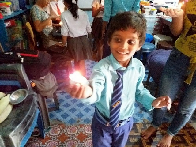 We had silver candles we had made ourselves, so we lighted one each, then placed all together I a swastika symbol. We did not have cake, no, because it is not a Nepali birthday celebration. I had ordered some sakkar (gud) and mixed it with various nuts from a mixed packet, like cashew, nuts, kismis, dry coconuts, etc., you know the masala. So, we all shared the birthday treat, and then we all had lemon sarbat, to cleanse the stomach.  Then we did the regular fun activities that were educational.