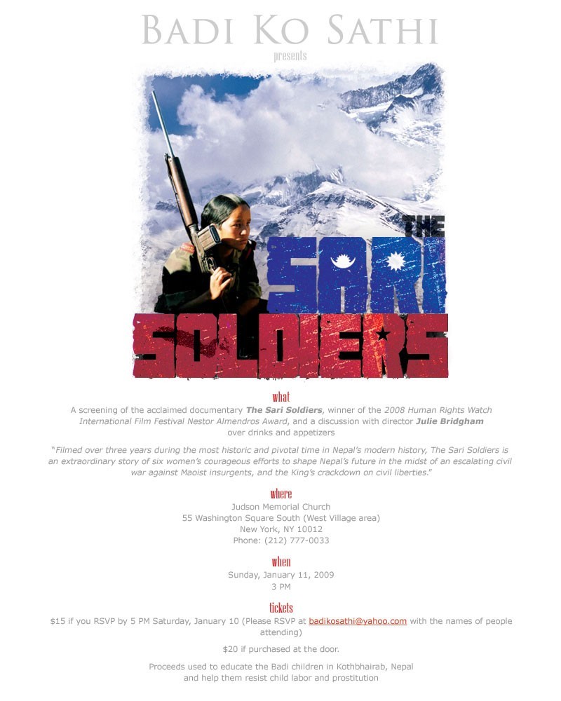 A screening of the acclaimed documentary The Sari Soldiers, winner of the 2008 Human Rights Watch International Film Festival Nestor Almendros Award, and a discussion with director Julie Bridgham over drinks and appetizers.
