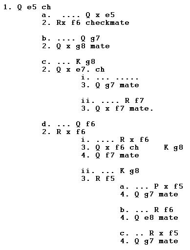 1. Q e5 ch a. .... Q x e5 2. Rx f6 checkmate b. .... Q g7 2. Q x g8 mate c. ... K g8 2. Q x e7. ch i. ... ..... 3. Q g7 mate ii. .... R f7 3. Q x f7 mate. d. ... Q f6 2. R x f6 i. .... R x f6 3. Q x f6 ch ... K g8 4. Q f7 mate ii. ... K g8 3. R f5 a. ... P x f5 4. Q g7 mate b. ... R f6 4. Q e8 mate c. .. R x f5 4. Q g7 mate