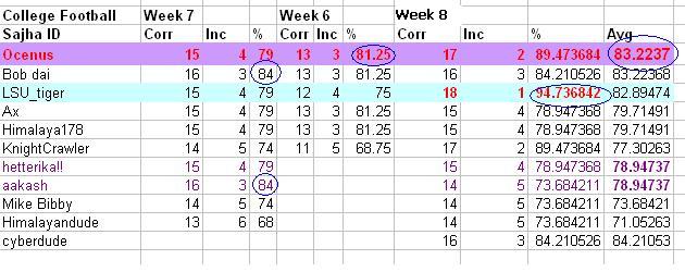 Week 8 Prediction Results.-- The Overall winner sofar is Ocenus and this week's winer..myself..Go TIGERS..;)