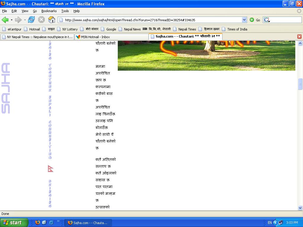 सबै गाम्लेहरूलाई नमस्ते मेरो बल्ल आईयो चौतारीको सेरोफेरो व्यस्तताको दलदलमा थिएँ भास्सिएको चौतारी हेर्न नपाई थिएँ निसास्सिएको सान्नानीलाई धनियाँबाद नयाँ चौतारीको लागि अब एकछिन यैं बस्छु सबै चिन्ता त्यागी जदौ चित्रेको! :)
