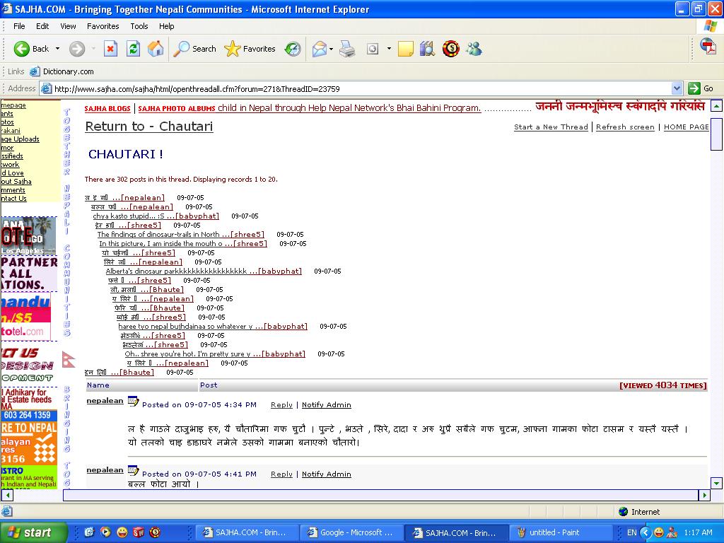 *# चौतारी ३६ #* Nepe – नेपे दाजी, Birkhe_Maila – जिम्माल बूढा, जिम्माल बा, बिर्खे माइल्दाइ, Dada_Giri – दादा, दादा बुरो, Nepesahila – साहिंला, Poonte – पून्टे दाई, पून्टेद, Kick – काका, GautamB. – गोताएँ, गोतामे ज्यू, Shree5 – सिरे, Bhaute – भउते, भौतेकाजी, Nepalean - नमे, Amazing – आइते, जंगे, Sandhurst_Lahure – लाहुरे जेठा, Camoflaged – कुम्ले, Miss_me – मास्टर्नी दिदी, मास्टर्नी नानी, मिस्, Pretty – सान्नानी, Uptowngal – ठूल्नानी, ठूली, Tyra – तितौरी, तिरू, Nirman – निरे, Ruina – रूइना, Matrix_rose – पुष्पपुरी, Ocean – मु्न्द्रे, Lau_ta_lau – लाले, Bostonian_nepali – बेंसीथाने नेपाली, Sano_kanchha – सान्कान्छा, Ishwor – ईश्वर, Floraj – फुलौरे, ज्योतिष महाराज, World_map – चित्रे, Echoes – धने, Dalli_Resham – डल्ली फुपू, Subha – सुभे, शुभ दिदी, Chipledhunga – चिप्ले, Foe_4_Misty – मिस्टे, Gwanche – ग्वाँचे, Sajha_user – सन्जु, Vata-ta-ta – भट्टे, Gaalab – गाले, Lootekukur- लुते, Sherpini – शेर्पिनी, Ma_chameli – चमेली, Ramkisne – रामकिस्ने, Nepal_ko_chora- नेप्चे, Cerine – सेरू, Yahoooo – यामे, Harke_kailo – काहिंला, Nails- चरिनंग्रे, Bob_dai – बबे दाई, Deep- दीप ज्यो, Gurl_Interrupted - ईन्द्रेणी , Manepaliketa - माने, Kalankisthan - कैले , Hetterika!! - हरितालिका, Regal - राँगे, रिकुटे, Juggy - जग्गे, मरन्च्यासे - च्यासे मान्छे जति दंग परेर हात, टाउको हल्लाउदै हिडे पनि सबैको आड मेरुदन्डमानै हुन्छ नत्र त गडेउला जस्तै भुइमा लडिबुडि खेल्दै हिड्नु पर्थ्यो । हुन त पुन्टे दाइ कैले काहि धोबिनीका तेसरीनै च्यात्तेको पटीकोटा लडिबुडि खेल्लछन,त्यो त तिनपानेले गर्दा हो । नत्र बिर्खे बुढा त लठ्ठी टेकेर भे पनि दुइ खुट्टाले हिड्छन,पुन्टे दाइ त कपाल झरे नि तरुनै छन,किन तेसो गर्नु पर्थयो र ? साझा देशमा कति धागा आए,कति गए, साझाकै मान्छे गन्ने भने नि नेपालको जनसंख्या भन्दा वढि होला तर मेरुदण्ड भएका चाहि औलाले गने हुन्छ । अझ साझाका धागोको कुरा गर्ने हो भने त ती कति कच्चा कि,प्याटै चुडिन्छन सानो तिनो बलले । यो चौतारी चै दिन दिनै बिलियो हुदै गयो,मैले त राम्रो संग भेउनै पाउन सकेको थिइन गाठी कुरो के भनेर मिसले भनेर पो थाहा भो "हाँसो खुशी मित्रता आत्मियता अनि आफ्नोपनको अनूभूति चौतारीको विशेषता"।साझाको ३४ धागोहरुलाइ एउटै वाक्यले ब्याख्या गर्ने हो भने त्यो भन्दा अर्को उपयुक्त के हुन सक्ला ? अब त चौतारी यति बलियो भएको छ कि, बामे सर्दै, ताते ताते गर्दे , दौडने भइसक्यो । चौतारी महोत्शब सकिए पनि चौतारी सम्मेलनको चाजो मिलाउदै हुनुहुन्छ के रे पुन्टे दाइ । म त मिले मुन्टाले टेकेर भए नि आउने सुर कसेकको हो गालबले चाही अमेरिका गाम तिर आउदा मेसो छोपेर यसो सानो तिनो फोन सम्मेलन गरिहाले । जे भए नि यो सानो फुलबारीमा मित्रता र आत्मियतालाइ माथि धकेल्दै गरम,यसलाइ आफ्ने बनाम,बिचैमा चटक्कै छोडेर हामिलाइ टुहुरो बनाउने काम चाही नगरम ।