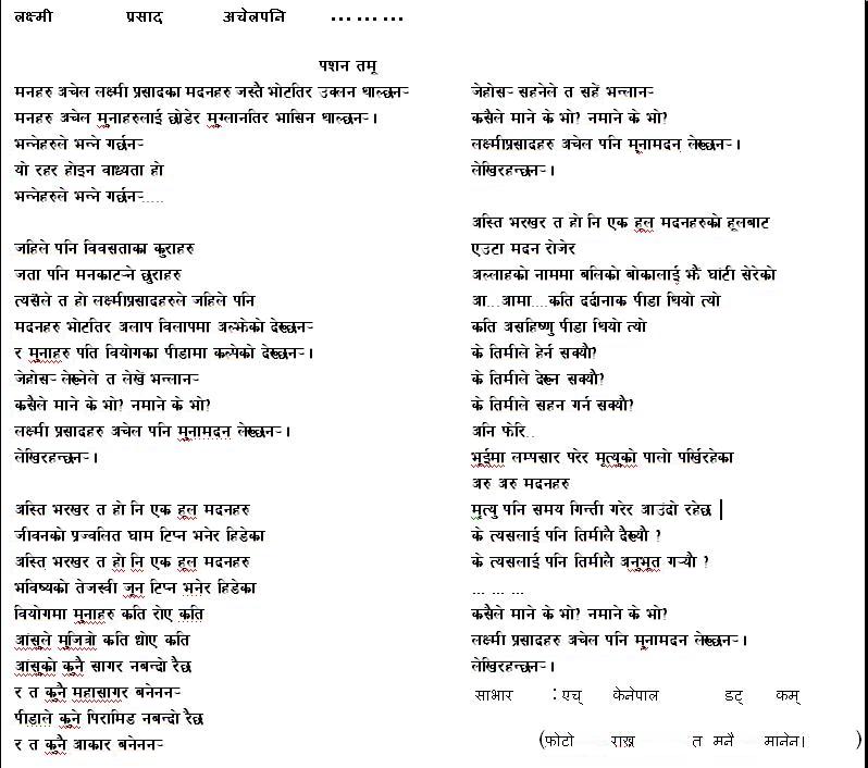 Nepe sir ko ultha pani ramailo lagyo. "यसो केहि कुरा गरयो कि, 'को होस् तँ ' भन्नु पर्ने हैन के तालको कुरा-गराई हो यो ? " yo chai hamro tolko maildai le dui twak layesi garne kuro jasto mitho lagyo. "सबभन्दा पहिले त बोल्ने तागत नै छैन, अब भए नै पनि के र आस लाग्ने कुरो पनि त हुनुपरयो नि, लौ मैले चाहेको यहि हो भनेर मुख खोल्न " yo chai rajnitik dal harule "AMAR BANI" bhanera party karyalaya ma tasnu paryo "घुट्क्याईहालियो मदिरा, अब यो जिज्ञासा उठ्या' छ ममा त्यो प्याला, अझ त्यो सुराही, अझ घ्याम्पोमा के के होला " yo ta bharstachari ra durachariharu lai lakshit garera lekhya jasto chha....nepal ma ta ahile yo censor pass hunna hola.. "जहाँ ज्यान जल्यो, रहर पनि त संगै डढे हुनन् हैन यो खरानीमा खोस्री खोस्री खोज्न खोजेको के ? " yo chai byapak lagyo..la. tyastai ustai parya belama ram mandir ma paschim bhasmeswor tira farkidai chilim tanera ghantau khai ke ke takna sakine slok jasto lagyo malai ta... "त्यो दुष्टलाई तह लगाउने, त्यो शत्रुलाई पाठ सिकाउने मात्र मनसाय थिएन, प्रिय त्यो तिम्रो मुखमा चोंचों मिलाउन आउने साथी बन्ला कि भन्ने ईर्श्या थियो खासमा " yo ta bange le mero barema maile bange ko barema kunai din paleko sochai bho "मादक मदिरा, कोमलाङ्गिनी फूल, मगमग अत्तर हरे ! यत्ति हो त हामीले कल्पना गरेको स्वर्गिय सुख ? " baki baadmei ni ta...kaso Nepe sir?