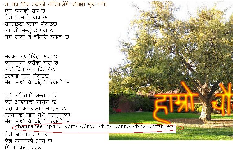 पून्टेदाईलाई मन परेन अक्षर गर्ने झिमिक झिमिक माउजिल्ला(Mozilla) प्रयोग गर्नुहूँदो रहेछ टोपी लाएर हिड्नु हुन्छ टिमिक टिमिक एक्सपोरर(IE) बाट समस्या सुल्झिन्छ ल हेरूम् पून्टेदाईको फोटू (ब्याकग्राउण्डमा) :P ;) (source: ramjham)
