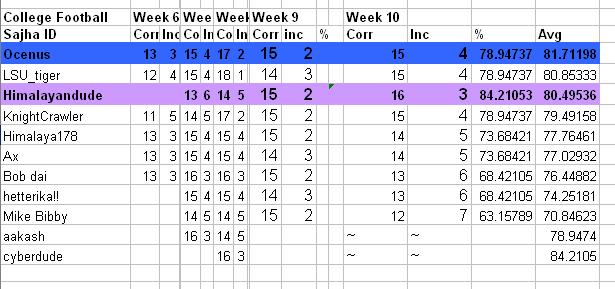 It's really not working man....Dyaamnn! :( Kudos to LSU_Tiger Bro! :) #1 Ohio State at Northwestern---------Ohio State #2 Michigan at Indiana------------------Michigan #3 Louisville at #15 Rutgers------------Rutgers #4 Texas at Kansas State---------------Texas Georgia at #5 Auburn-------------------Auburn South Carolina at #6 Florida------------Florida #21 Oregon at #7 USC------------------Oregon #8 California at Arizona-----------------California #9 Notre Dame at Air Force------------Notre Dame Cincinnati at #10 West Virginia--------West Virginia #13 Tennessee at #11 Arkansas-------Arkansas Alabama at #12 LSU---------------------LSU #14 Boise State at San Jose State-----Boise State #16 Wisconsin at Iowa------------------Wisconsin Texas Tech at #17 Oklahoma----------Oklahoma #18 Wake Forest at Florida State------Wake Forest #19 Georgia Tech at North Carolina---North Carolina Kent State at #20 Virginia Tech--------Va Tech Duke at #22 Boston College------------BC Miami (FL) at #23 Maryland------------MD Nebraska at #24 Texas A&M-----------Nebraska Wyoming at #25 Brigham Young------Brigham Young