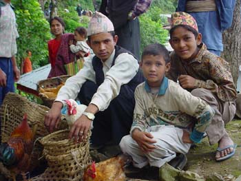 सिरे चैं लाउरे दाइले लेइदेको घरी ढल्काउँदै, च्याट्ट टोपी र आस्कोट लाएर कुखुरा बेच्न गओ छ आज बजार तिर। .