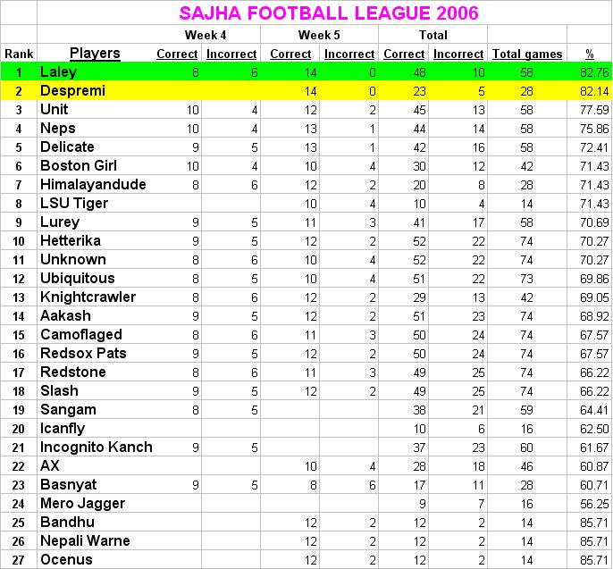 welcome slash............... congratulation proud bro, ya are sole overall leader with 48 wins. above template was for week 6 following is the week 5 results............