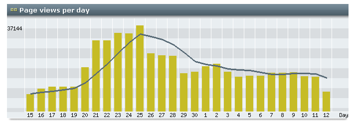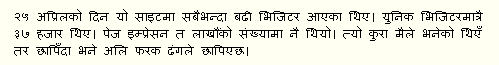 Congratulations to Umeshji for his unfaltering work in blog journalism. This was one of the only sources of information for many Nepalis living outiside Nepal. It is however irresponsible of Nepalitimes to wrongly published his visitor information as "Shrestha's Merosansar site notched 67,000 visitors on a single day on 25 April." According to the webstats in the site, there were 37144 Page Views on April 25. How can 67,000 visitors view 37144 pages even if each of them visited one page? Umeshji should clear that misinformation up.