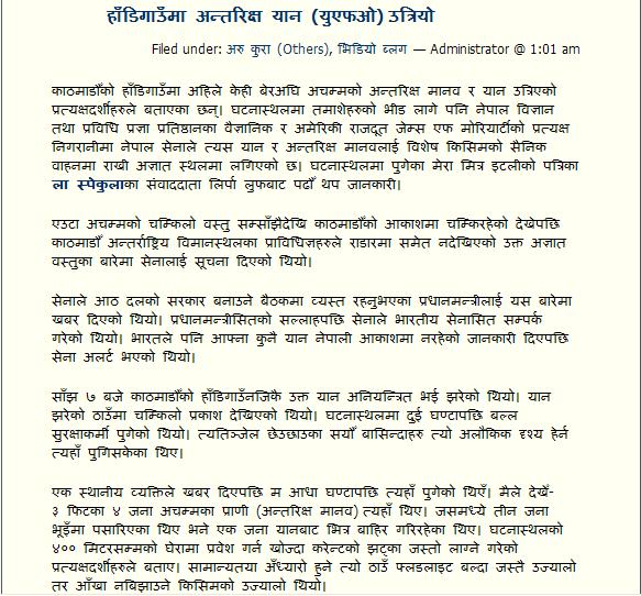 According to Nesw, Pranchanda said: "The UFO is sent by the palace to defame the Maoists. We should immediately delclare Nepal as a republic." Prachanda further said that he smells rat in the whole UFO thing and believes that the Royal Palace should immediately take responsibility of the event.