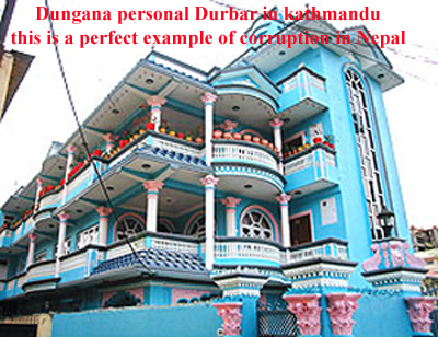 “A Police Inspector can never make a big house [pic below which we first saw on the front page of Kantipur the other day] in an expensive area of Kathmandu like Bishal Nagar within three or four years of job. News has come that he has made many other houses like that. He has been officially charged of kidnapping people, brining them into the Police Headquarters and looting them. The quietness of Nepal Police has become a stark reality in such a regime even after the fact that Inspector did all those dirty things with the knowledge of IGP Thapa has been widely publicized.”
