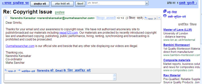 Regarding the videos on my website, They are not hosted/ published on N epal123.com I have been in constant contact with one of the founding members of Maha Sanchar (since s/he is a family). S/he knows about the videos that I have linked to. I have not heard anything officially from MAHA Sanchar, yet. If I do, I will respect their order and delete the link to their videos from my website. If they are concerned about the copyright issues etc. I recommend MAHA Sanchar or any other producers to contact Video Hosting websites. Same suggestion goes out to Smritu.
