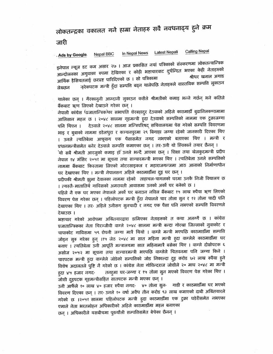 Please find a worth reading article related to corruption in Nepal (source: enepalnews.com, 07-11-2007). Apparently, most of our prominent leaders are heavily involved in corruption. No one seems to be scared of possible punishment. DB