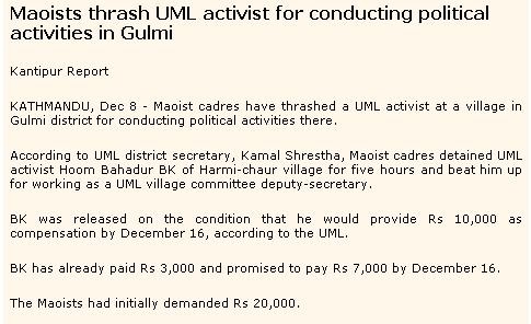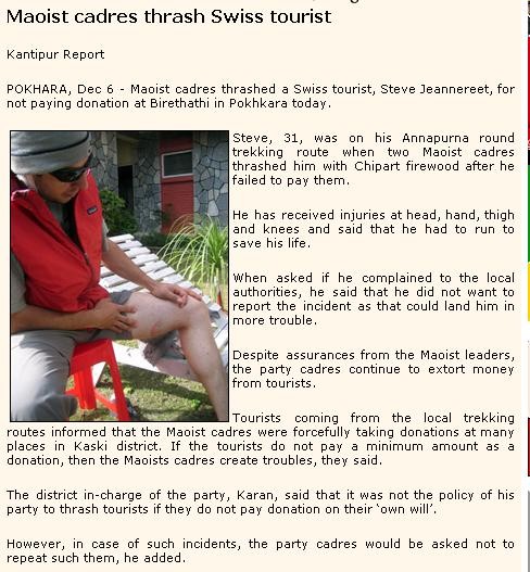 "मेरो बिचार त्यो काम माओवादी को होइन। त्यो काम त भारतीय विस्तारवादी अनी अमेरिकी साम्राज्यवादी तत्वोहरुले माओवादीहरुलाई बदनाम गर्न गरेको हुन।" Well this could be another possible reasoning by the Maoists  . Whatsoever, I liked the latest act of beating the tourist. That's the showmanship. Also considering the punishment by Maoists meted out on general public, they are still discriminating. Why they don't kill one or two tourists too so that everyone is genuinely convinced that they are the proponents of equality. Good going guys.