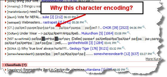 Guys, When I open Sajha.com, I see lots of thread names with Russian (or whatever) character encodings. But when I actually open the thread, it's a one with thread title in Nepali Characters. Sabalai yestai bha chha ki tin barsa agaadi maile piyeko जांड balla aayera lagna thalyo?