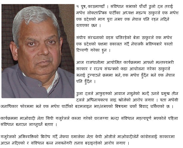 Hernus sathi haru aaba Hamro Nepal ma jasle je bolda pani hune bhayo.Aaja Reporter's Nepal ko programme ma Bharatiye Dalal(Mahanta Thakur) le yeso bhanecha :"एक मधेश एक प्रदेश नभ्ए सिङो नेपाल रहन दिन्नौ ".yesh ko kura sunda lagi rahecha Hamro Nepal  yesh  ko mama ko ghoda ho,jo jun bela pani India lai gift dina sakincha.Malai ta yo news padhera sarhai rish uthyo ,tapai haru pani yo news padhnus ani comment garnus kasto lagyo.