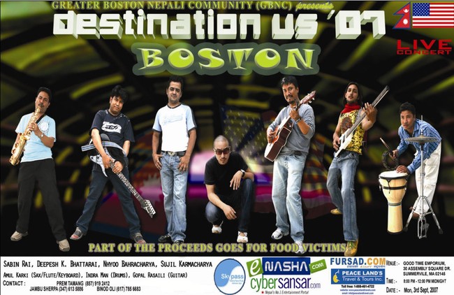 Charity show for flood victims in Nepal, organized by G.B.N.C Date : September 3rd 2007 Monday at 7:00 pm Venue : 30 Assembly Sq Good Times Emporium, Somerville MA Ticket : $20 Contact G.B.N.C Members: Binod Oli - 617-785-6683 Prem Tamang -857-919-2412 Jangbu Sherpa - 347-613-5886 Ranjan Budahathoki - 617-319-9541 Min K.C - 617-645-4149 Lila Rawat - 617-838-4988 Dhan Pun- 617-416-6835 Pallavi Joshi -617-773-3177 Bishnu Karki - 857-540-9799