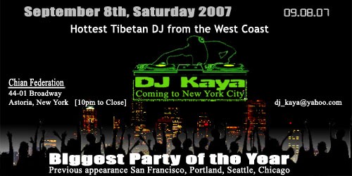 Hottest Tibetan DJ from the west coast Coming to New York City Sept 8th 2007 10PM to Close Chian federation Astoria, NY Previous appearance in SFO, Seattle, Portland, Chicago