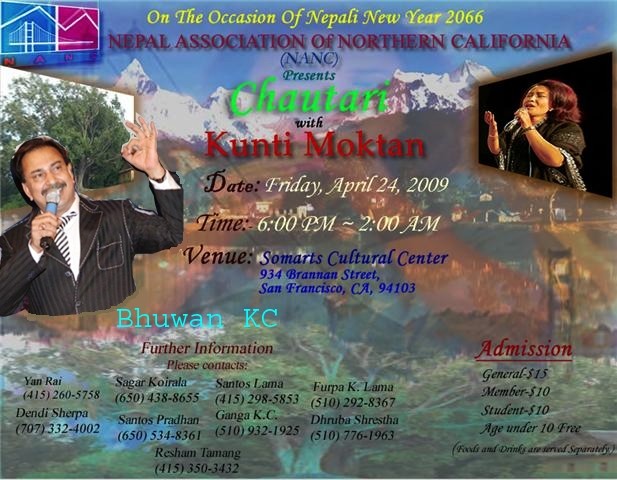 Due to some technical problem the New Year 2066 Party is cancelled.............Please dont forget to join the NANC CHAUTARI NIGHT WITH KUNTI MOKTAN & BHUWAN K.C.........on 24th April 2009 Friday...........