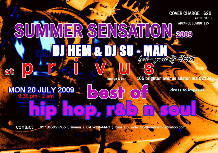 yes!!!! doing it again this summer with dj hem and dj su-man spinning best of hip-hop and r&b welcoming all new comers to boston and our special boston fans. bring in guests too. this summer sensation is all about meeting friends and being friends .............so east coast lets do it again. for advance tickets please call the numbers on the flyer or buy it at the venue till 19th july. group of 10 tickets pay only for 9 ( big saving!!!!!! )