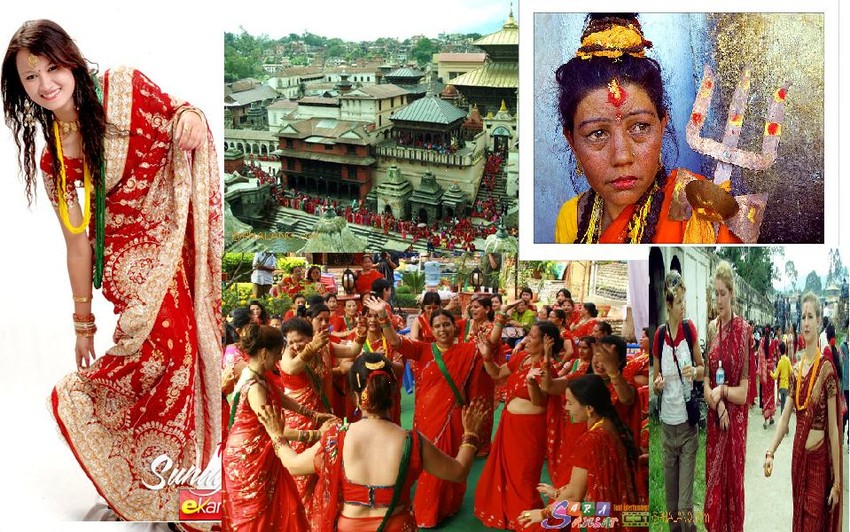 Teej,its a fasting festival for women...it is celebrated for marital bliss,well-being of husband and purification of own body..there's a small red insect that comes out of soil during rain on august or early september thats why women have to wear red on this festival.. so,all the women are invited..BUT plz,be advised no boys are allowed in this event even the small boys...