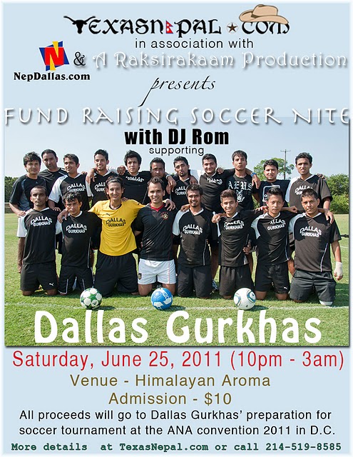 TexasNepal.com, in association with NepDallas.com and A Raksirakaam production, is organizing a fundraising soccer nite on Saturday, June 25, 2011 at Himalayan Aroma with DJ ROM to support local Nepali soccer team Dallas Gurkhas for their participation at ANA convention 2011.