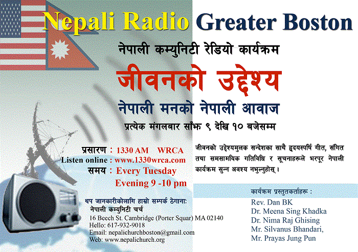 We are glad to inform you that Nepali Community Church, Cambridge has initiated to bring out Nepali community radio program for the first time in New England (purely not-for profit making) from 6th Dec 2011. Our program will be aired from 9pm to 10 pm every Tuesday from 1330am WRCA frequency. It also can be listened live online at http://www.1330wrca.comTo make this initiative known to all of Nepalese brothers and sisters in Greater Boston and beyond, we request you to please share this news with your friends.