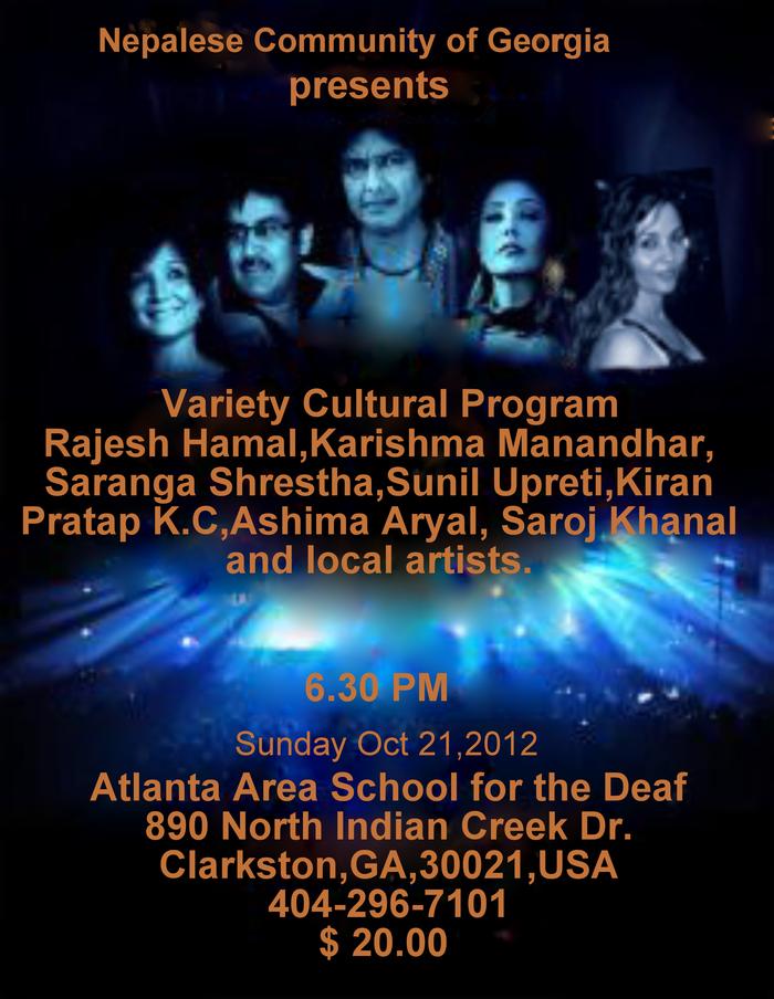 You are cordially invited to join us for NAG and NASeA supported, the most sensational Nepali variety cultural program with Nepali cine super stars Rajesh Hamal, Karishma Manandhar, Saroj Khanal, Saranga Shrestha, Sunil Upreti, Kiran Pratap KC, Ashima Aryal and local talents.
