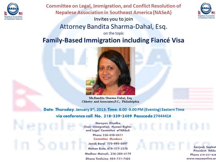 Join NASeA Immigration Call with attorney Bandita Sharma-Dahal on the topic 'Family-Based Immigration including Fiancé Visa' on Thursday, Jan 03 at 08.00 PM Eastern (Yes 8 PM in the evening) via conference call 218-339-2409 Pass Code: 2744441
