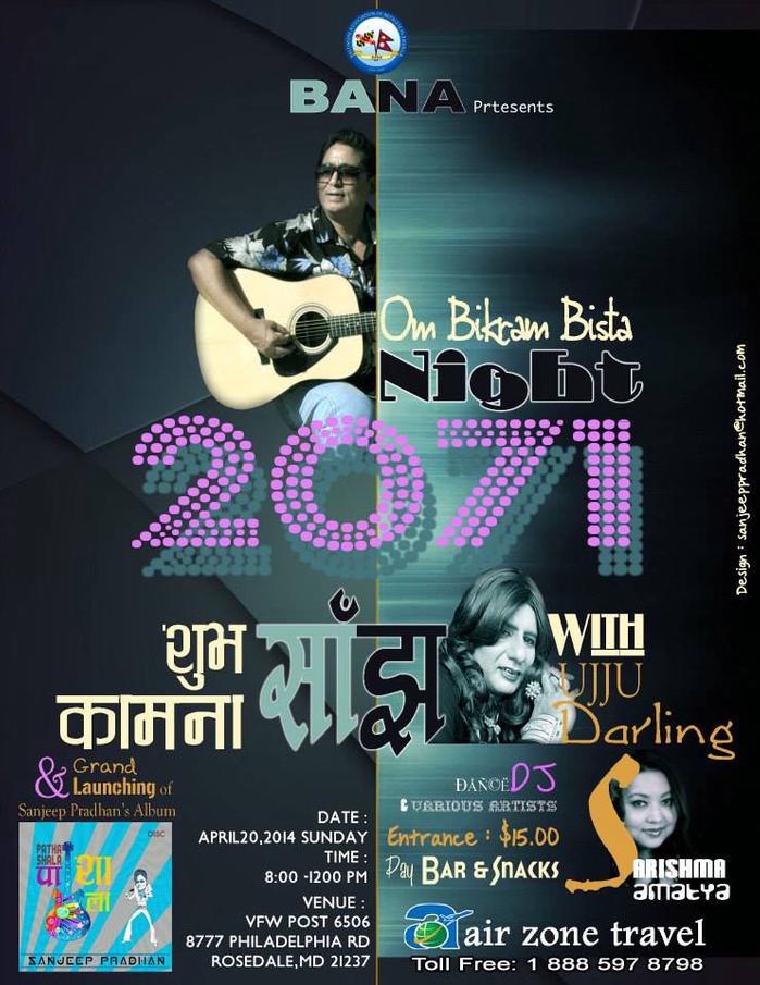बाल्टिमोर एसोसिएसन अफ नेपलिज इन अमेरिका(वाना)ले तदअनुसार अप्रिल २०, २०१४ का दिन नयाँ वर्ष २०७१ को कार्यक्रम धुमधामका साथ मनाउने निर्णय गरेको छ । कार्यक्रममा नयाँवर्षको आदानप्रदानका साथसाथै विभिन्न ख्यातिप्राप्त कलाकारहरु र स्थानीय कलाकारहरुको सुमधुर गीत तथा नृत्यका साथै डिजेको समेत व्यवस्था गरेको छ । उक्त कार्यकम्रमा यहाँको गरिमामय उपस्थितिको लागि वाना कार्य समिति हार्दिक निमन्त्रणा गर्दछ ।