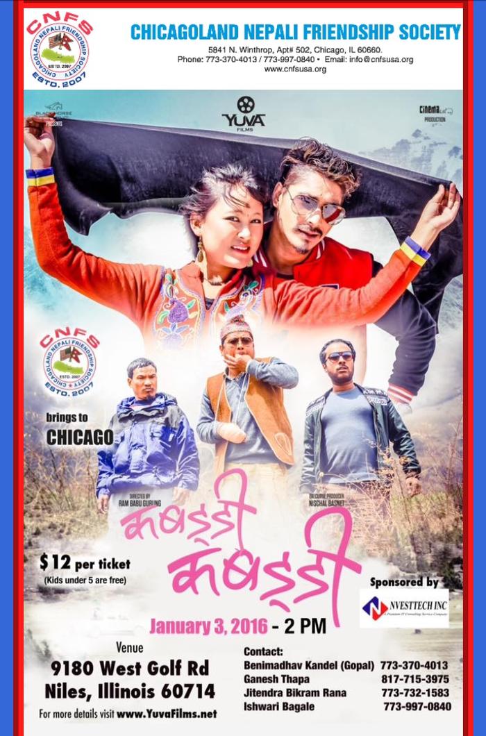 CNFS is going to screen new Nepali movie titled "Kabaddi Kabaddi" on January 3rd, 2015, Sunday at 2:00 PM at Movie Max Cinema (Big Cinema) located on 9180 W Golf Rd, Niles, IL 60714. Please contact below to get your ticket in advance and watch this popular movie with your family and friends to support Nepali film industry. We have one show scheduled and seats are limited.