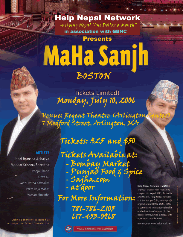 Boston MAHA Sanjh is moved to Monday, July 10, 2006. The Program will start at 6:30 PM at Regent Theatre in Arlington . Help Nepal Network USA (HeNN-USA) is proud to present MaHa Sanjh in nine US Cities this summer. As a part of the US Tour, MaHa will be performing at Regent Theatre in Arlington on Monday, July 10, 2006 at 6:30 PM Directions at the bottom of the page . Information on other shows available at www.sajha.com. The MaHa team will help raise funds for a 13-bed health post in Haripurwa Village in Sarlahi District with the estimated cost of about $25,000 and also raise funds for other HeNN projects. MaHa is scheduled to have performances in seven cities in collaboration with various local organizations. HeNN is a global charity founded and run by Nepalese with registered chapters in Nepal , UK , Australia and USA . HeNN-USA, a registered 501(c) (3) non-profit organization, planned the entire US tour. This effort is being led by Shailesh Gongal, Chairman of HeNN-USA . With a slogan 'One Dollar a Month Fund for Nepal ,' HeNN aims to raise at least a dollar a month from every Nepali to provide health and education to the needy communities in Nepal. HeNN has successfully completed more than two-dozen projects in the areas of health and education in different parts of Nepal . Currently, HeNN is also collaborating with a British Charity, Nepal Balbalika Trust, to build a shelter in Dhulikhel, in the outskirts of Kathmandu , for Conflict Impacted Children in Nepal. Please join us for this fun filled program with two new prahasans and a musical night with Nepali folk songs and dances on Monday, July 10, 2006 and support a noble cause. Due to limited seating, we encourage you to buy tickets in advance. Artists: Madan Krishna Shrestha, Hari Bamsha Acharya, Pooja Chand, Mani Ratna Kansakar, Kiran KC, Prem Raja Mahat and Yaman Shrestha Tickets for MAHA Show in Boston available at: 781-786-2105 or 617-453-0968 www.sajha.com ( http://www.sajha.com/sajha/html/eventdetail.cfm?eventid=675 ) Bombay Market , Somerville Punjab, Arlington At the door on the event day Location: The Regent Theatre w 7 Medford Street w Arlington, MA 02474 Ticket Price: Premium seating : $50 Standard Seating: $25 ******************************************************** Please contact HeNNTickets@yahoo.com for reservations. ******************************************************** Video Cameras NOT ALLOWED Limited tickets available. One Person One Ticket. Tickets are not refundable. Net proceeds of the event will go towards Help Nepal Network [501 (c) (3)] projects. For more information on Help Nepal Network please visit our web site http://www.HelpNepal.net The purchaser of this ticket must bring a printed receipt of the confirmation along with a Government issued photo ID to claim your reserved tickets. The tickets will be available at the door 1 hour prior to the start of the event until the time the show starts. Questions: HeNNTickets@yahoo.com Phone: 781-786-2105 http://www.helpNepal.net