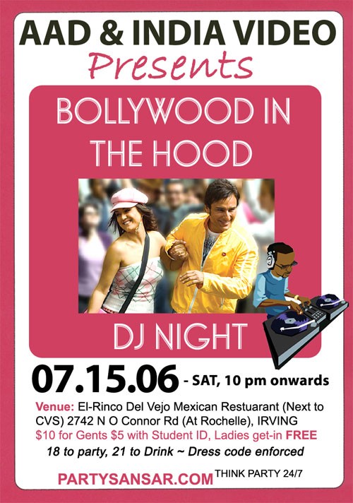A.A.D. & India Video Presents Invites You On This Saturday Just The Way You Like It! Where The Best Of Both World Meet And Beautiful People Rule. Date: Saturday, July 15, 2006 EVENT INFO: A.A.D. & India Video Presents Bollywood in the Hood DJ Night 10pm till closing Simply The Best For The Best! Free admission for Girls . $10.00 for Guys. ($5 with Student ID) A.A.D...Adds Good Vibe In Your Life. EL RINCON DEL VIEJO Mexican Restaurant 2742 N. O'Connor ( At Rochelle ) Suite 104 Irving TX 75062 Details @ 682-465-2353 For more INFO. visit www.partysansar.com