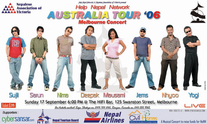 Help Nepal Network and Nepalese Association of Victoria proudly present Help Nepal Australia Tour 2006 Live Concert in Melbourne featuring some of the finest Modern Day Nepalese Singers and Musicians. * Deepak Bajracharya * Mausami Gurung * Sarun Tamrakar (from the Uglyz band) * Nima Rumba * Jems Pradhan * Nhyoo Bajracharya * Yogeswor Amatya * Sujil Karmacharya (from Season's band) * Gopal Rasaili * Amul Karki * Indra Man This is going to be as big as it sounds. Come prepared for the wonderful night. Date: Sunday 17th of September Time: 6pm Venue: The HiFi Bar, 125 Swanston Street, Melbourne Tix: $35 / Under 10 Free For tickets/more info, please contact Raju Shakya on 0414 724 042 or Ranjan Koirala on 040 550 9155