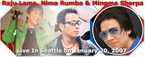 Raju Lama (The Mangolian Heart), Nima Rumba and Mingma Sherpa LIVE IN SEATTLE Nepal Seattle Society proudly presents Nepal's top of the top Pop Stars - Raju Lama (The Mangolian Heart), Nima Rumba and Mingma Sherpa Live in Seattle. After successful performances in New York, Los Angeles, San Francisco, Texas, Atlanta, Minnesota, Chicago, Toronto, and now Live in Seattle. Please join us for this sensational musical event on January 20, 2007, Saturday at 6:30pm. Date: ==== January 20, 2007, Saturday @ 6:30 PM Tickets: ===== $20 each Children under 10 - FREE For Tickets Contact: ============= Dhan B. Pun, 206-321-5779 Shanti Thapa, 206-245-5246 Sita Gurung, 206-250-0971 Karma Sherpa, 206-255-0613 Diwakar Thapa, 206-427-9896 Shova Rana, 206-265-2684 Shree Ram Dahal, 206-915-3314 Joany Pradhan, 206-789-7673 Madan Shrestha, 206-427-7818 Kiran Shrestha, 206-854-6837 Krishna/Anita Gurung, 206-909-2853 Sarmila/Raju Adhikari, 206-229-3719 For reservation: ~~~~~~~~~~ E-mail NSS: info@nepalseattle.org. Venue: ===== Venue will be updated shortly, please check back often at: http://www.nepalseattle.org/events.php. After Hours NSS DJs:.......... Dance till you drop with Raju Lama, Nima Rumba and Mingma Sherpa. Sponsors: ====== Please e-mail NSS immediately: info@nepalseattle.org. Thank you and see you at the event. Nepal Seattle Society(NSS) PO Box 45633 Seattle, WA 98145 Tel : 1-206-321-5779 Fax: 1-806-403-2447 info@nepalseattle.org http://www.nepalseattle.org A Washington Non-profit 501(c)(3) Corporation "Promoting & Preserving Nepali Culture, Traditions and Heritage"