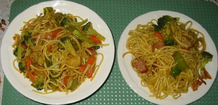 भुटेको तीलको गेंडो, काँचो तीलको तेल, भिट्नामिज् हट् सस्, र भिट्नामिज् होईसिन् सस् (गाढा खैरो रंगको हुन्छ, चाईनिज् स्टोर मै पाईन्छ) हालेर मोल्ने। हतारको बेला मिठो, सादा चाउमिन्। कहिले काहिं चईं कुक्ड्, रेडी (फ्रोजन्) श्रिम्प नि हाल्छु।